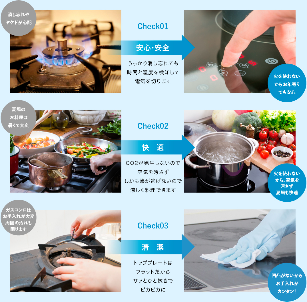 ガス漏れの心配なし。さらに安全に配慮したセーフティー機能も。